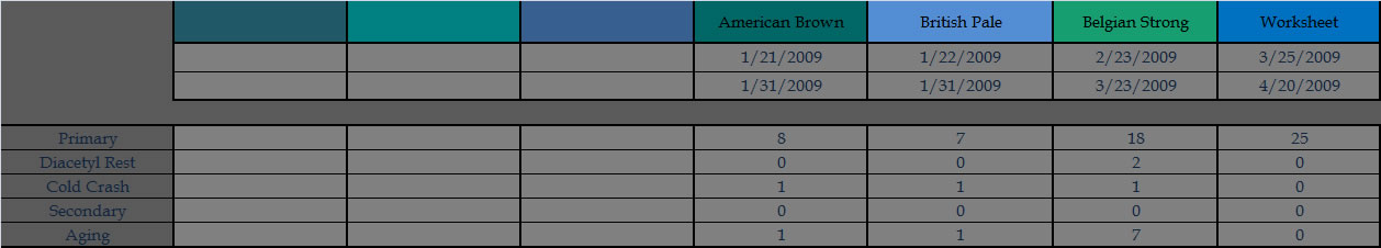 To choose which recipes are shown in the display use the dropdown in each color filled cell. The color will correspond to colored rows in the Calendar display. The Worksheet is not a dropdown and allows the Worksheet's schedule to always be shown in the Calendar. After choosing a recipe from the dropdown the Brew Date & Drink Dates will be shown, along with their Fermentation Schedule.
